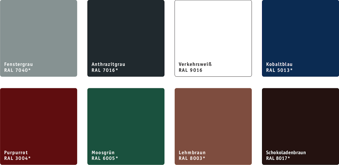 Unser Basis-Farbsortiment für Aluminium-Oberflächen ist durchgängig erhältlich: von der Haustür zum Fenster, über Schiebetüren bis zu Rollladen, Rollladenkasten und Fensterbank. Für weitere Farbvarianten beachten Sie bitte das PaX-Farbsystem.