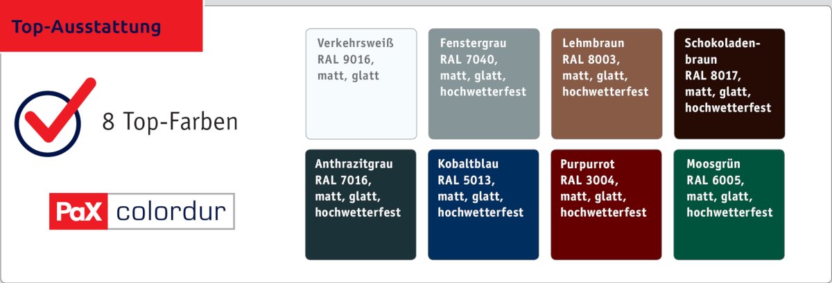 Bereits im Standard haben diese PaX-Haustüren eine Menge zu bieten und eine große Auswahl. Wer darüber hinaus variieren möchte, hat viele Möglichkeiten: Wählen Sie aus zahlreichen, besonders widerstandsfähigen Top-Farben (FG3, FG6) mit edler Feinstrukturoberfläche Ihren Favoriten. Modern und formschön: für beidseitig flügelüberdeckende und einseitig flügelüberdeckende Varianten bieten wir verdeckt liegende Bänder. Informieren Sie sich in der Aktionsbroschüre über noch mehr Extras!