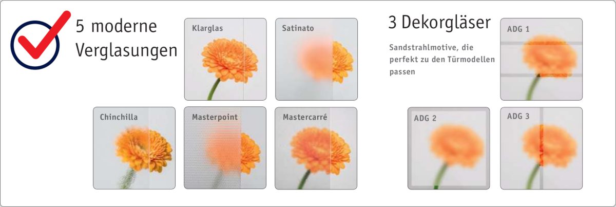 - wahlweise 5 Verglasungen sowie 3 Dekorgläser inklusive