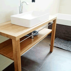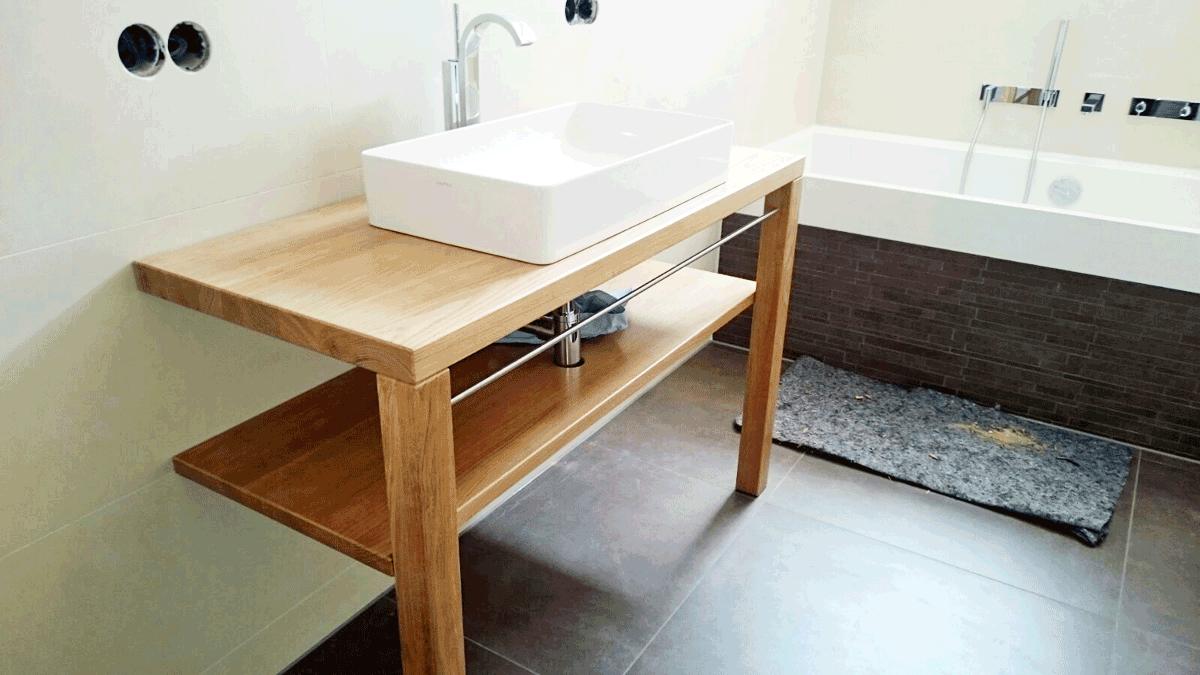Herstellung und Montage eines Bad-Möbels in Friedberg bestehend aus Eiche-Massivholzplatten und massiven Ständern. In die Konstruktion integriert ist ein Handtuchhalter aus Edelstahl.