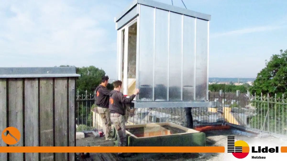 Der Wunsch des Kunden bestand darin zukünftig vom Wohnzimmer aus, das darüberliegende Flachdach mit Dachterrasse erreichen zu können. Hierfür war es notwendig die Dachkonstruktion zu öffnen, eine Treppe ins Wohnzimmer einzubauen und ein Dachausstiegshäuschen auf das Flachdach zu montieren. Zum Schluss musste der Boden im Wohnzimmer an die Treppe angepasst und das neu entstandene Treppenhaus mit Gipskartonplatten verkleidet werden.
