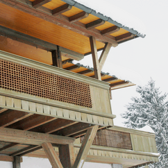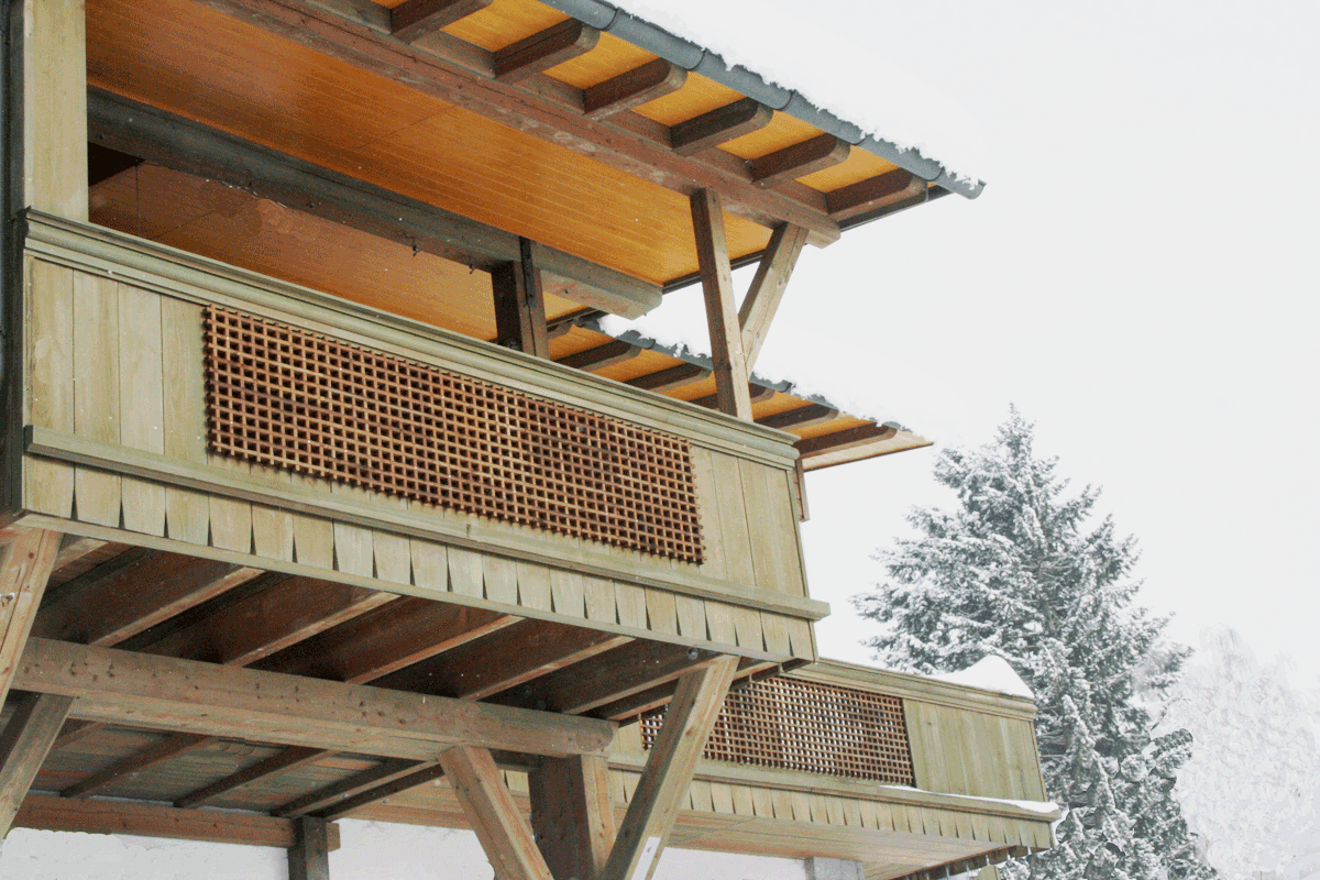 Anstelle einer Terrasse kann auch ein Balkon ein Haus oder eine Wohnung zum Garten hin erschließen. Gerade an einer Hanglage kann somit attraktiver Lebensraum geschaffen werden. Bei diesem Projekt in Ottmarshausen war die Planung des Holzbaus sehr anspruchsvoll, da ein ebenengleicher Zugang zum Haus geschaffen sowie bei abfallendem Gelände die Fundamente geplant und ausgeführt werden mussten. Zusätzlich musste noch ein Anschluss an die bestehende Dachfläche hergestellt werden.