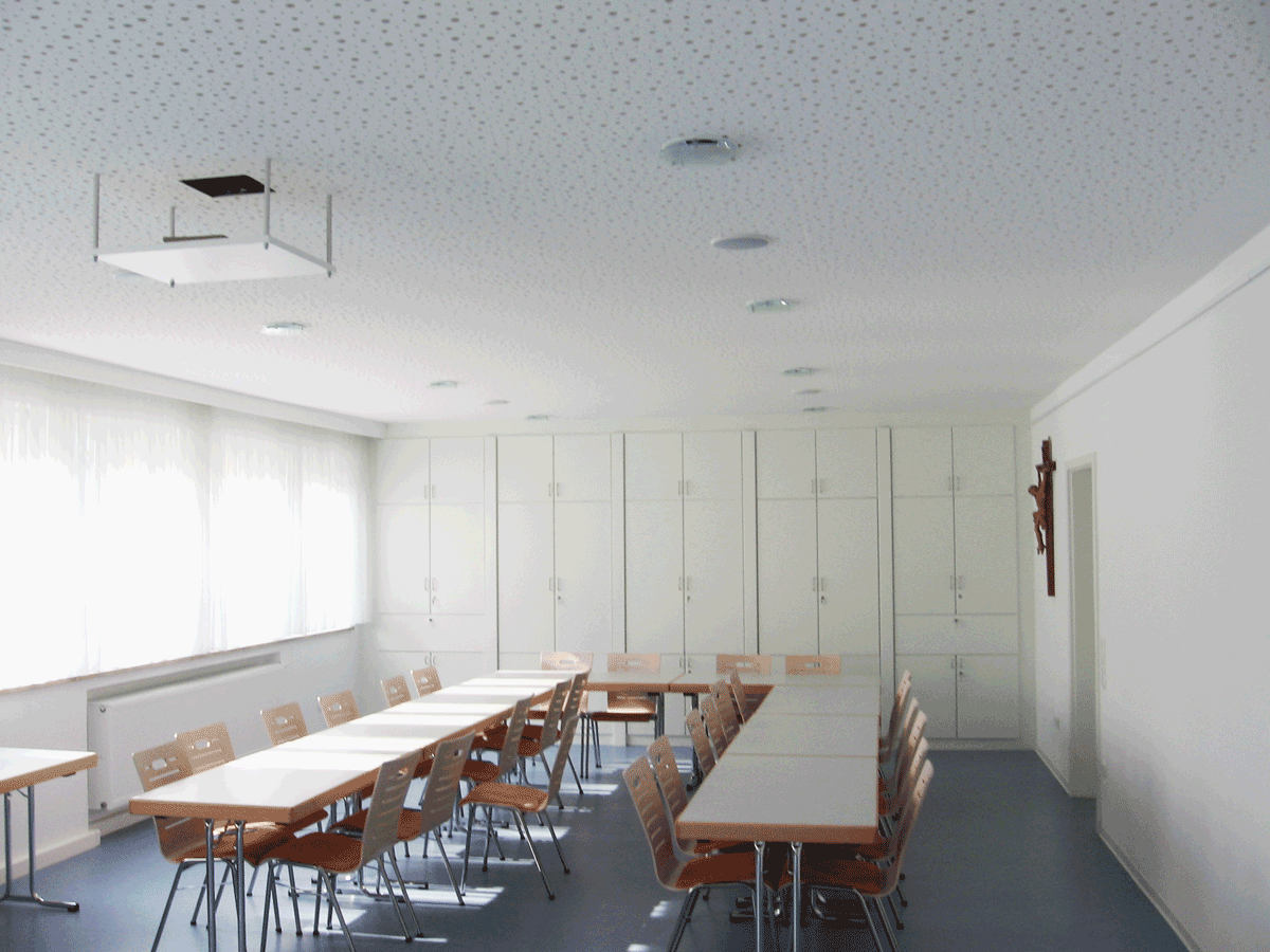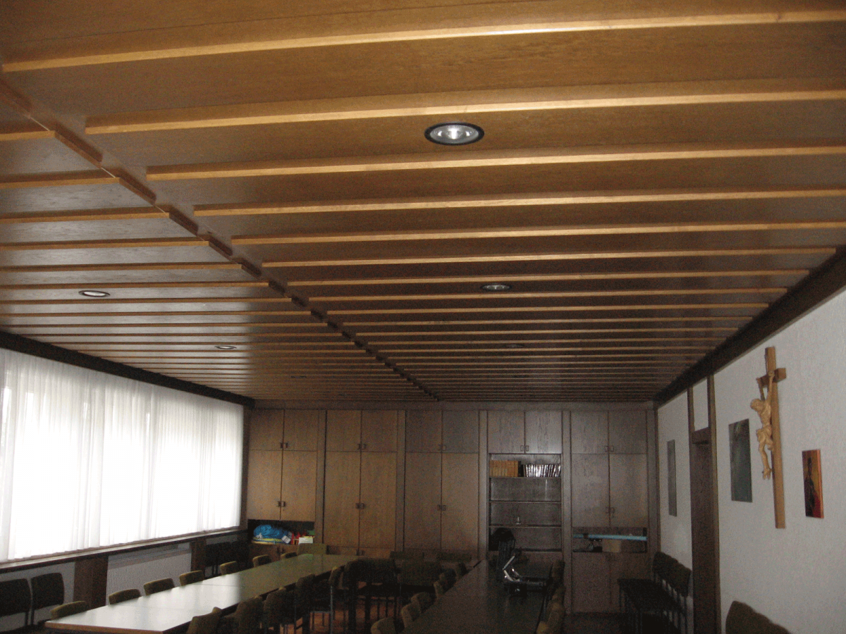 Der Vorher-Nachher Vergleich zeigt, was im Innenausbau alles möglich ist. Durch eine helle, weiße Akkustikdecke wirkt der Raum weniger drückend und gewinnt an Offenheit. Gleiches gilt für die Schrankwände, die überarbeitet und weiß gestrichen werden. Ein neuer Boden und neue Tagungsmöbel runden den Gesamteindruck ab.