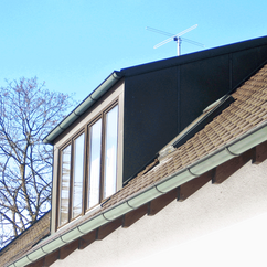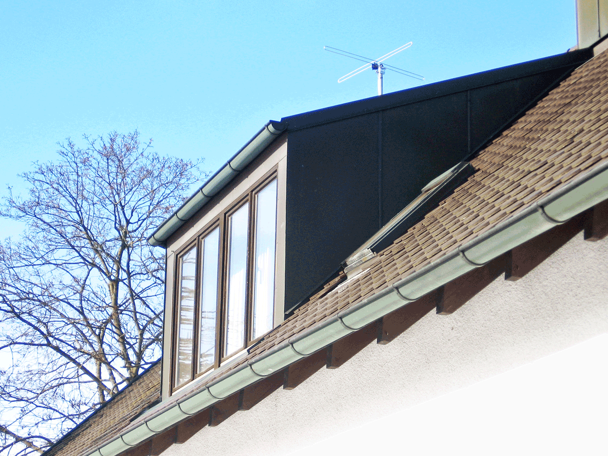 Um im Inneren mehr Platz zu gewinnen, ist es oft sinnvoll eine Gaube einzubauen. In diesem Projekt wurden die Gaubenwangen verblecht und oben mit Biberschwanz-Ziegeln eingedeckt.